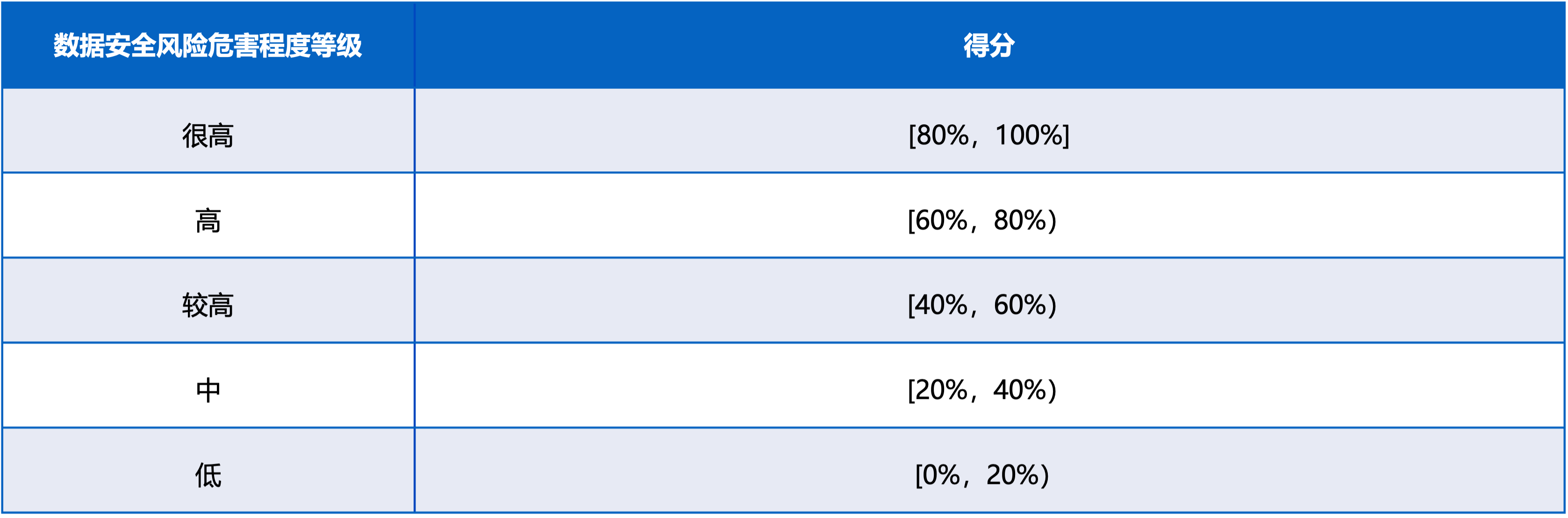 數(shù)據(jù)安全風(fēng)險(xiǎn)危害程度分析主要考慮數(shù)據(jù)價(jià)值、風(fēng)險(xiǎn)源嚴(yán)重程度等因素,結(jié)合數(shù)據(jù)級(jí)別、規(guī)模、種類、處理目的、方式、范圍等情況,綜合分析數(shù)據(jù)安全風(fēng)險(xiǎn)一旦發(fā)生,對(duì)國(guó)家安全、公共利益、組織或者個(gè)人合法權(quán)益造成的危害程度,將風(fēng)險(xiǎn)危害程度從低到高劃分為低、中、較高、高、很高5個(gè)等級(jí)。